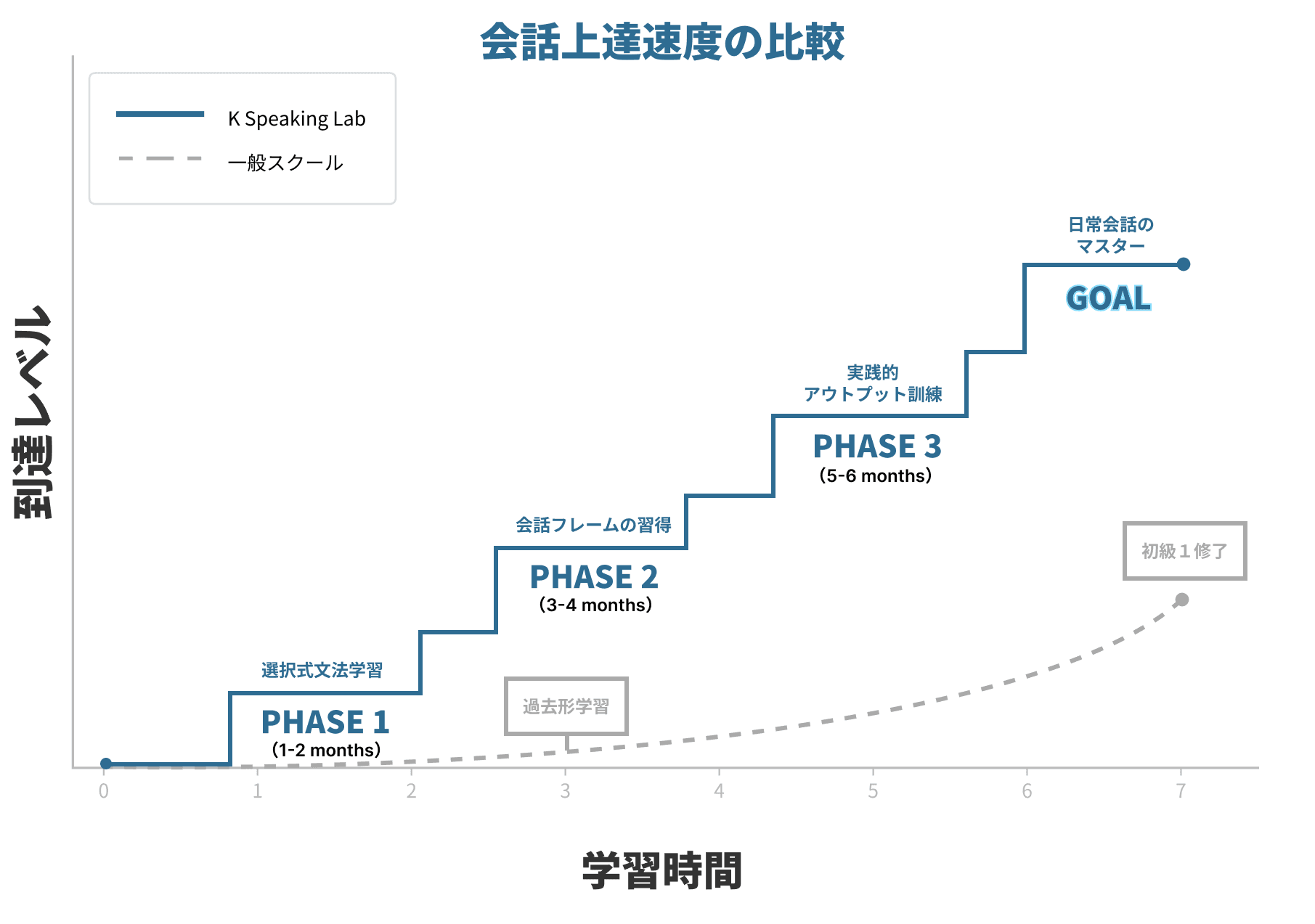 1:1固定担任制を基に、日常会話の土台をわずか5ヶ月間で作り上げる。その後は「コーチング&フリートーク(1回30分)」に切り替え「必要な時に、必要なものを、必要な分だけ」学習することができます。